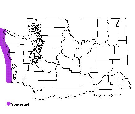 Cassin's Auklets can be found from Alaska to Mexico. They are abundant in many parts of their range, but in others they have experienced significant declines. With an estimated total of over 88,000 birds, the Cassin's Auklet is the most numerous breeding seabird (aside from the gulls) in Washington. They make up 34% of all breeding seabirds in the state, yet they breed on only six islands. Numbers fluctuate considerably from year to year, in response to changes in food supply and to climatic events such as El Niņo. Although they are abundant, on their nesting colonies Cassin's Auklets are vulnerable to disturbance from humans and introduced predators. Oil contamination is another potential threat on the breeding colonies and on feeding grounds at sea. Since nesting colonies in Washington are protected as wildlife refuges, human disturbance is minimized. However with colonies concentrated on a small number of islands, habitat destruction or degradation on even one of those islands could significantly affect the population in Washington.