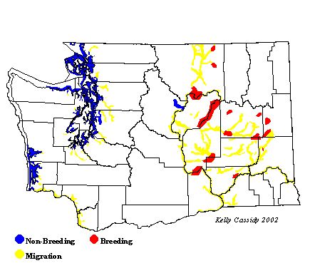 Eared Grebes are commonly found nesting in large ponds and lakes at lower elevations in eastern Washington. They can also be found on the east side of the Okanogan River. In the Columbia Basin, colonies occur in suitable ponds and lakes up to the Ponderosa pine zone in Spokane County and throughout the Channeled Scablands. They are not found breeding in the south-central part of the Columbia Basin. They are found fairly commonly as migrants and occasionally as winter residents on open fresh water and less commonly on salt water in western Washington and the Columbia Basin. When found wintering on the west side of Washington, they usually in ones or twos. However, staging locations such as Soap Lake and nesting colonies in Kahlotus Lake often have hundreds of individuals.
