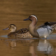 The Garganey, an Old World dabbling duck, is closely related to the Northern Shoveler and the Blue-winged and Cinnamon Teals. Like these, it is found primarily in freshwater wetlands and shallow ponds, where it feeds by filtering small particles from water passed through its bill rather than by tipping up. The male in breeding plumage is unmistakable, with gray flanks and a bold, white eyebrow crossing to the back of the brown head and curving down toward the neck. Females, juveniles, and non-breeding-plumaged males are difficult to separate from Blue-winged and Cinnamon Teals but have a stronger facial pattern than these.