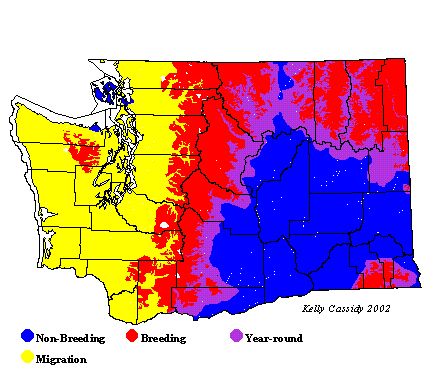 In breeding season, Townsend's Solitaires are common in high-elevation forested areas throughout Washington, including high-elevation alpine parkland areas along the Cascade crest, and near Mount Rainier and other major volcanoes. They can be found in the northeast Olympic Mountains where they nest above 3,500 feet, although they are absent from the wet forests in the western and southern Olympics, which aren't as steep at the northeast part of the range. In eastern Washington, Townsend's Solitaires can also be found in lower-elevation forests, such as the Dishman Hills area near Spokane. They are common in the eastern Blue Mountains, but uncommon in the western Blue Mountains above 2,000 feet. They are fairly common migrants on the San Juan Islands in a very limited window of time each spring. You can see them in the foothills on the west side of the Cascades in early spring, waiting to go up the stream courses.