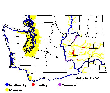 Western Grebes can be found during the breeding season on large ponds and reservoirs in the Big Sage/Fescue zones in eastern Washington, especially at Moses Lake and Potholes Reservoir in Grant County. Nesting colonies have also been found near Crab Creek, Frenchman Hills Wasteway, Lake Lenore, and many ponds in the Columbia National Wildlife Refuge, all in Grant County. In Douglas County they can be found at Banks Lake. Non-breeders can be found in the summer in coastal regions of the state as well, such as in Bellingham Bay. In winter Western Grebes are rare in eastern Washington but common on the coast and in Puget Sound. Wintering flocks with birds numbering in the thousands were historically present in Bellingham Bay. Now large numbers of Western Grebes winter at Quartermaster Harbor (Vashon-Maury Island) and Saratoga Passage. There are also a few hundred on Lake Washington and on Elliott Bay.